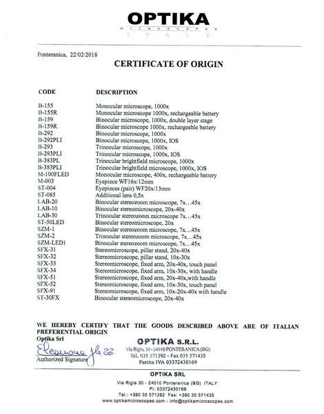 Вся продукция Optika SRL произведена в Италии. В небольшом городке Понтераника (провинция Бергамо) осуществляется разработка, производство и сборка микроскопов Optika. Каждый микроскоп сопровождается индивидуальным серийным номером, указанным на корпусе и в гарантийном талоне, а также отметкой о прохождении конечного контроля качества. Все изделия соответствуют основным требованиям соответствующих европейских директив ЕС и стандартам Европейского Союза.