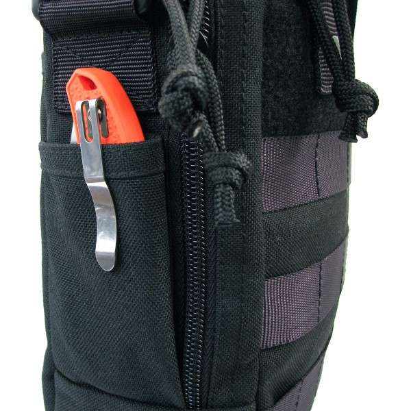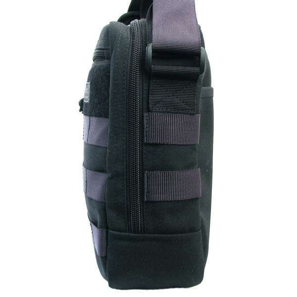 Снаружи сумка оснащена стропами системы MOLLE, которые дадут возможность расширить функционал сумки дополнительными подсумками. Наружная велкро-панель служит для установки идентификационных патчей или нашивок. Лямка через плечо оснащена демпфером, регулируется по длине, а при и полностью.