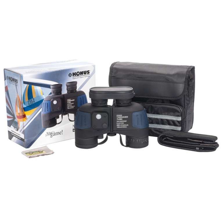 Корпус бинокля заполнен азотом, укреплен металлическими О-кольцами и покрыт герметизирующим, противоскользящим и противоударным резиновым «панцирем». Резиновое покрытие цвета мокрого асфальта снабжено вставками голубого цвета для быстрого распознавания бинокля на воде. Изначально модель KONUS Tornadoразрабатывалась для удовлетворения потребностей армии и торгового флота, но со временем приобрела популярность среди яхтсменов-любителей, охотников и рыбаков.