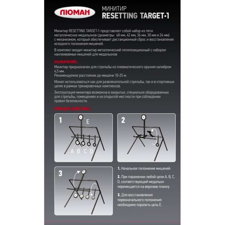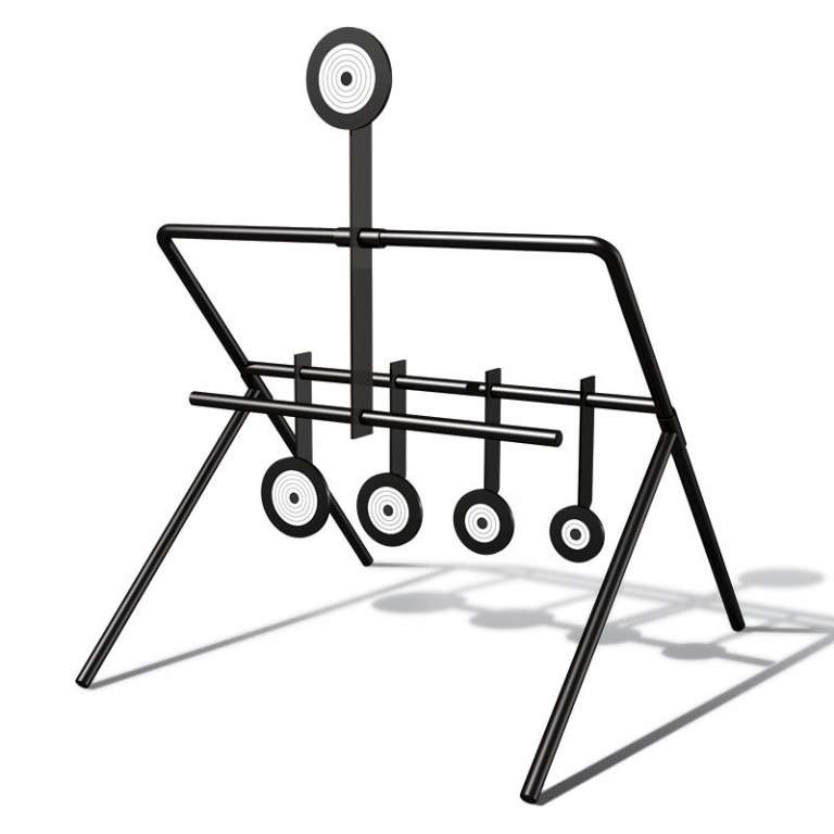 Мишень механическая сбрасываемая для пневматического оружия калибра 4,5 мм, представляет собой набор из пяти металлических медальонов( диаметры: 48 мм, 42 мм, 36 мм, 30 мм и 24 мм) с механизмом, который обеспечивает дистанционный сброс и восстановление исходного положения мишеней. Изготовлена из стали толщиной 3 мм.