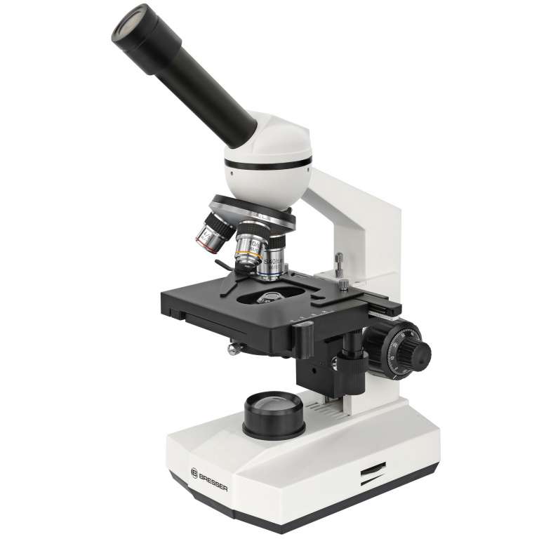Монокулярная насадка, наклонённая под углом 45º, свободно и очень плавно вращается в горизонтальной плоскости и позволяет проводить исследования в любой позиции без перемещения прибора в пространстве, наблюдая изображение высокого качества. Револьверная головка имеет посадочные гнезда для трех объективов стандарта DIN 4х, 10х и 40х (подпружиненный). окуляр, поставляемый в комплекте, выполнен по широкоугольной схеме и предоставляет широкое поле зрение. При необходимости получения больших увеличений микроскоп может быть оснащен дополнительными окулярами и объективами. Светодиод обеспечивает равномерную подсветку препарата проходящим светом с правильной цветопередачей. Направленность освещения регулируется конденсатором Аббе с числовой апертурой NA 1.25, что позволяет опционально использовать объективы с большей кратностью (до 100х). Конденсор отцентрован на фабрике, однако имеет два крепежно-центровочных винта, позволяющих произвести необходимую корректировку. При необходимости проведения наблюдений в темном поле можно установить темнопольный сухой конденсор Bresser, или темнопольный масляный конденсор Bresser. Количество света регулируется ирисовой апертурной диафрагмой (позволяет плавно, бесступенчато регулировать интенсивность освещённости). Под диафрагмой расположен фильтродержатель для фильтров стандартного диаметра 32 мм. Подвижный предметный столик с препаратоводителем, микрометрической тонкой и грубой подстройкой, возможностью крепления двух образцов одновременно, обеспечивает максимально точное позиционирование объекта наблюдения под объективом микроскопа и его перемещение в плоскости. Питание микроскопа осуществляется от сменных батарей самого распространенного типоразмера АА (Alcaline) 1.5 V (допускается замена на аккумуляторы AA Ni-Mg 1.2 V. Таким образом микроскоп может быть использован в полевых условиях без привязки к электросети переменного тока. Микроскоп поставляется в персональном пластиковом транспортировочном кейсе. Прибор и аксессуары размещены в ложементах, вырезанных в поролоновой основе. Для легкого старта наблюдений в комплекте с микроскопом поставляется набор готовых слайдов, предметных и покровных стекол. Кроме того, в комплектацию входит адаптер для камеры смартфона (планшета). Адаптер крепится на тубусе микроскопа и позволяет проводить фото и видеосъемку основной либо фронтальной камерой гаджета. Гладкая тыльная сторона смартфона надежно крепится с помощью множества присосок адаптера (в случае рифленой тыльной поверхности смартфона рекомендуется использовать фронтальную камеру).