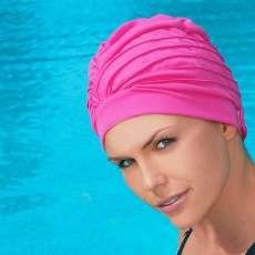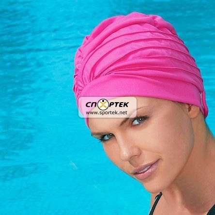 Шапочка для плавания женская тканевая с полиэтиленовой подкладкой и резиновым ободком.