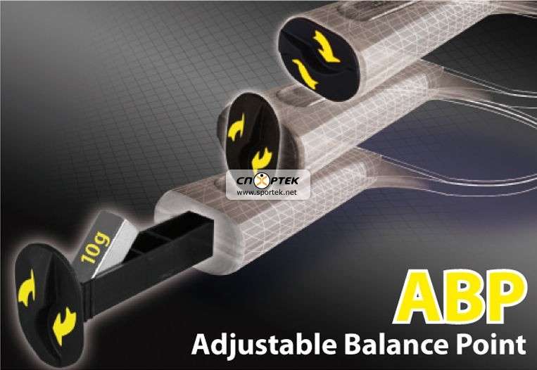 Применение технологии: Adjustable Balance Point (ABP) - Регулируемая Точка Равновесия ABP позволяет игроку индивидуально менять центр тяжести ракетки соответственно своему стилю игры.