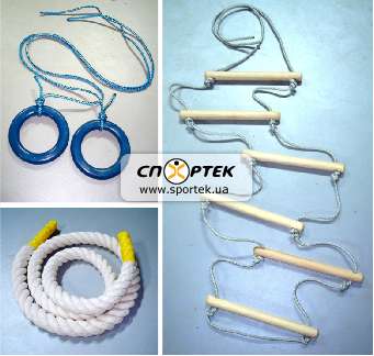 Комплект состоит из колец, прикрепленных к прочного шнура, каната и лесенки с деревянными перекладинами.
