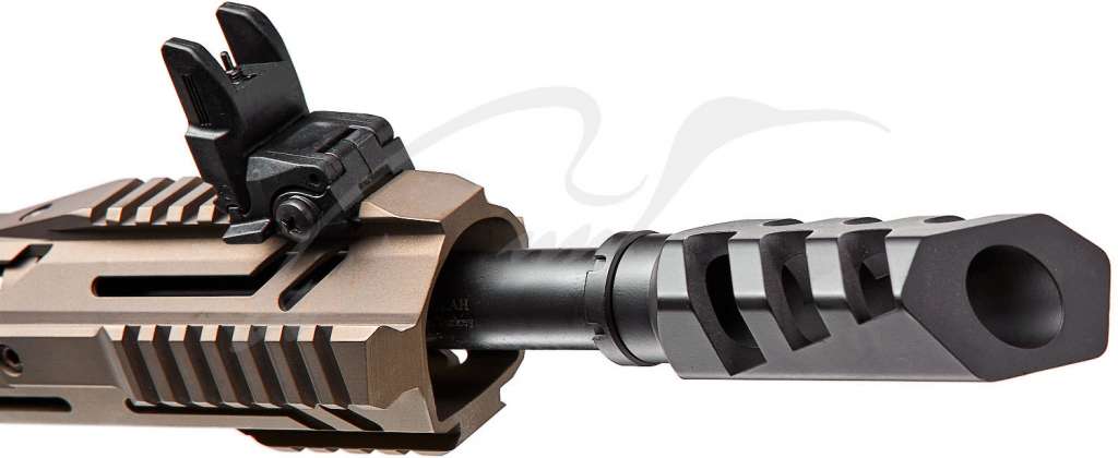 Для упрощения обращения с оружием и максимального контроля при темповой стрельбе на ствол установлен дульный тормоз, значительно снижающий подброс ствола (в модификации Sport).