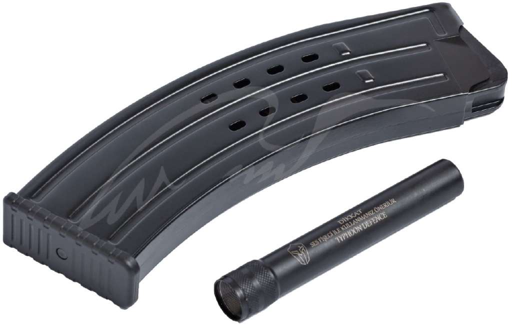 Ружье Typhoon Light представлено в двух модификациях – с фиксированным и телескопическим прикладом. В комплекте дополнительный 10-зарядный магазин и удлинитель ствола. Поставляется в картонной коробке.