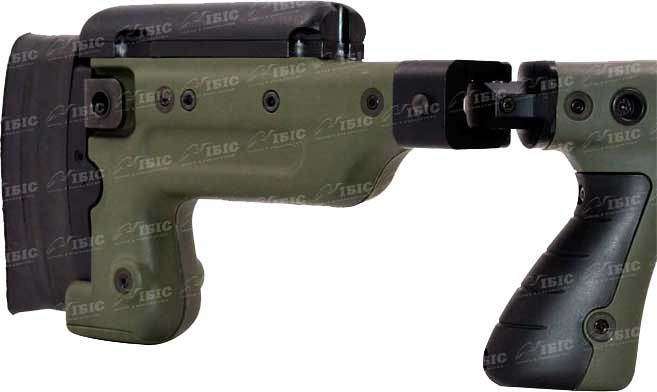 Складной приклад имеет регулировку затылка по углу наклона в плоскости перпендикулярной оси винтовки и по высоте, регулировку по длине за счет проставок и регулировку высоты щеки. С обоих сторон оснащен антабками для ремня, а также дополнительным упором (моноподом) новой конструкции в вырезе под «слабую» руку.