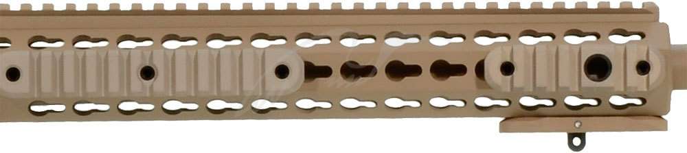 Такая конструкция цевья сочетает в себе широкие возможности для крепления сошек, прицелов и насадок к ним, блоков ЛЦУ, дополнительных опорных рукоятей в сочетании с эффективным отводом горячего воздуха от ствола через неиспользуемые крепежные отверстия.