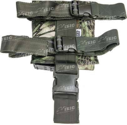 -Крепится на бедро за счет пары съемных регулируемых ремней с застежками «Fastex» и эластичными вставками, которые фиксируются на подсумке с помощью липучек «Velcro». Дополнительно имеется вертикальный подвес с застежкой «Fastex» и липучкой «Velcro» для крепления за поясной ремень.