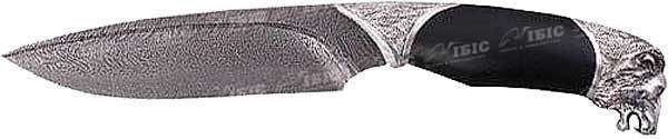 Удобный рабочий нож традиционной формы. Затыльник рукояти выполнен в виде головы льва, передняя втулка ножа имитирует шкуру животного. Мощный клинок ручной ковки выполнен по технологии дамасских сталей. По клинку пущен тонкий дол переменного профиля (выполняется вручную по каленой стали). В целом нож смотрится весьма презентабельно, без лишних украшений, удобен на охоте, на природе, в то же время неплохо смотрится как интерьерная вещь в домашней коллекции любителя холодного оружия.