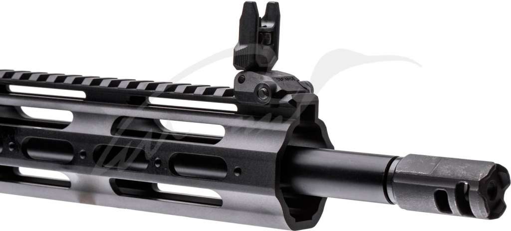 Установлено алюминиевое консольное цевье, шестипозиционный телескопический приклад и складные целик с мушкой.
