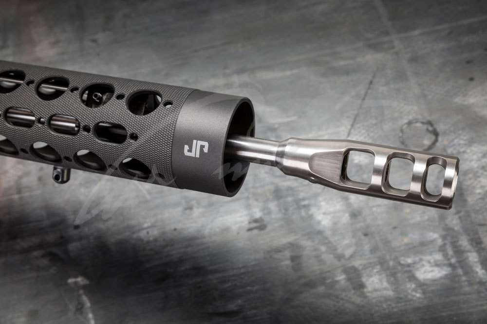 Свободно вывешенный матчевый ствол легкого контура «JP Supermatch™» изготовлен из нержавеющей стали марки 416R с применением криогенной обработки. Нарезы и поля нарезов формируются под давлением, методом «Button-rifling» – продавливания специального стержня внутрь просверленной заготовки ствола. Точность изготовления нарезов и внутренняя геометрия ствола контролируется с помощью воздушного датчика «Air gauge» – это метод, применяемый для определения колебаний высоты полей и нарезов внутри ствола с использованием постоянного потока воздуха через специальный зонд. Ствол посажен в ресивер с использованием технологии «Thermo-Fit™», что обеспечивает жесткую фиксацию с минимальными допусками. Установлен трехкамерный дульный тормоз-компенсатор JP. Внешняя поверхность ствола и ДТК отполированы.