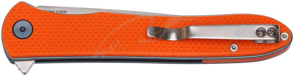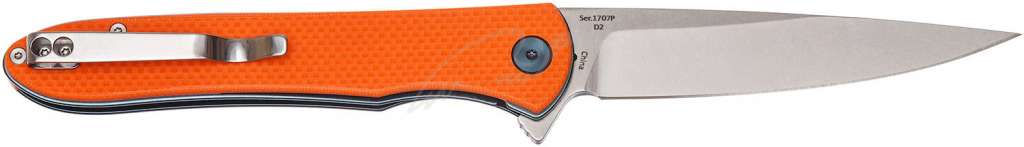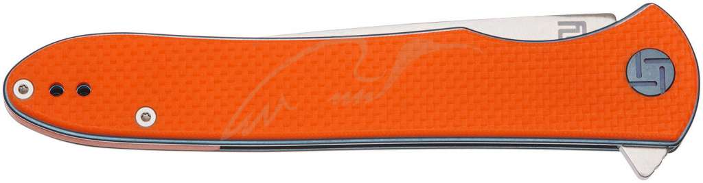 Отдельного внимания заслуживает рукоять из стеклотекстолита G10, которая способствует лучшему удержанию ножа в руке. Оранжевые накладки на рукоять гармонично смотрятся с фурнитурой синего цвета.
