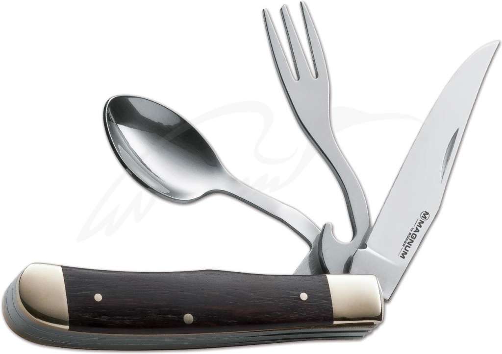 Компактный складной нож Boker Magnum Bon Appetite пригодится в туристических походах или просто выездах на природу. Клинок, вилка с открывалкой и ложка изготовлены из нержавеющей стали 440А. Благодаря своей конструкции столовые приборы могут использоваться отдельно от ножа. Накладки рукояти выполнены из многослойной фанеры. Клинок извлекается при помощи ногтевого зацепа. Тип замка – slipjoint.