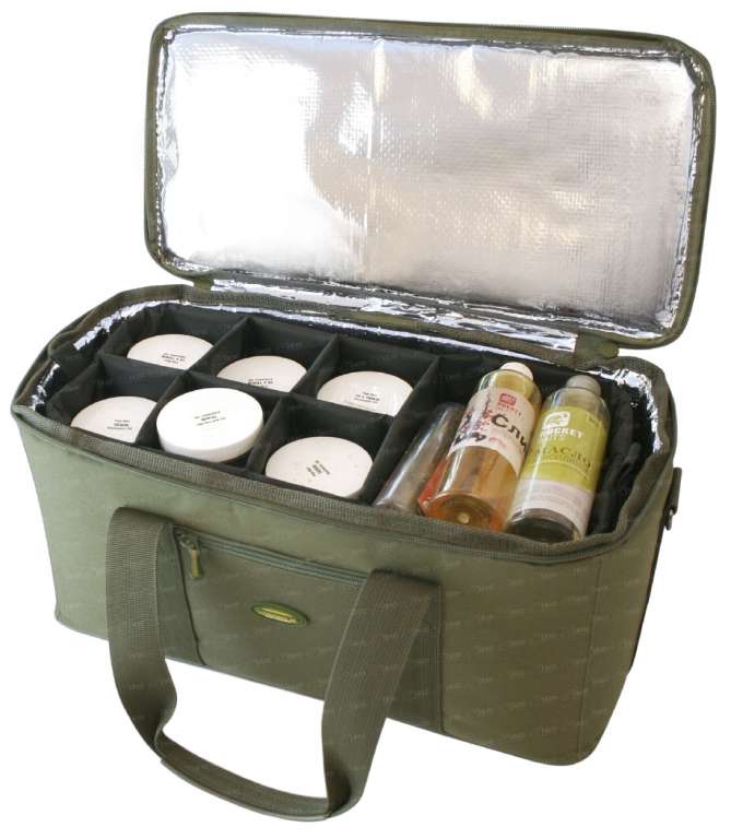 Сумка с термозащитой. Отличительная особенность - два внутренних модуля с ячейками (всё лежит на своих местах и не болтается), укомплектована аккумулятором холода. В стенках сумки вшит теплоизоляционный материал - пенополиэтилен толщиной 10 мм (в два раза толще, чем в предыдущих моделях). Подкладочный материал - термоматериал фольгированый на износостойкой полипропиленовой основе (отлично зарекомендовал себя на ведрах с термозащитой).