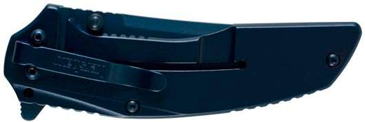 Клинок в формате Trailing Point с фальшлезвием и насечками на обухе, выполнен из стали 8Cr13MoV с PVD покрытием. Открывается как флиппером, так и шпеньком и фиксируется на замок Frame Lock.
