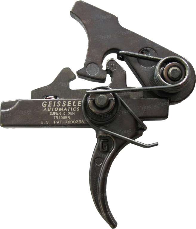 Ударно-спусковой механизм Geissele Super 3 Gun (SG3) - усовершенствованный УСМ для карабинов на базе AR-10 и AR-15. УСМ Geissele SG3 одноступенчатый, без возможности регулировки усилия спуска. Построен на базе двухступенчатого УСМ Super Select-Fire (SSF) созданного для боевого применения. УСМ Geissele SG3 был разработан специально для соревнований в дисциплине 3 Gun. Спуск плавный, усилие спуска равно 1,47 кг или 1,8 кг в зависимости от установленной пружины.