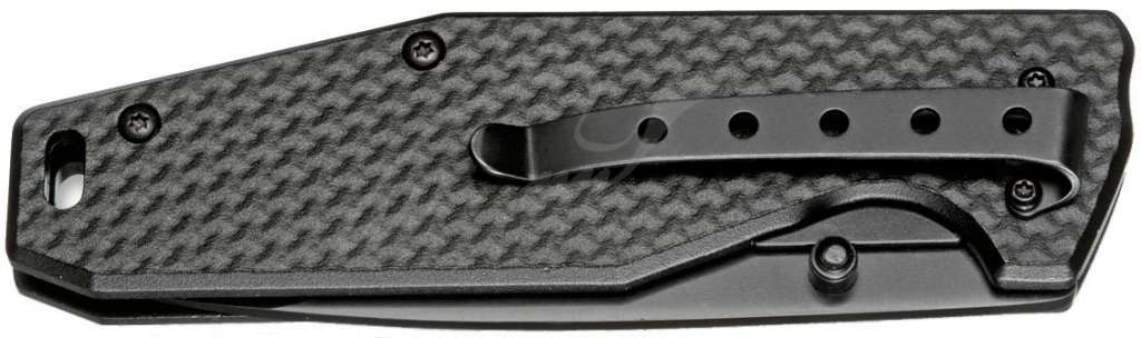Клинок наиболее распространенного и универсального профиля Drop Point с черным покрытием. Выброс осуществляется при помощи двустороннего шпенька.