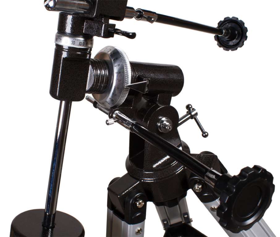 Телескоп установлен на экваториальной монтировке немецкого типа с координатными кругами. Монтировка имеет ручной привод, но есть возможность установки электродвигателя для компенсации суточного вращения небесной сферы – тогда объект не будет постоянно «убегать» из поля зрения, монтировка сама будет поворачивать объектив телескопа вслед за ним. Монтировка установлена на легком алюминиевом штативе, высота которого регулируется в широких пределах. Это позволяет настроить телескоп для наблюдателя любого роста так, чтобы окуляр всегда находился на уровне глаз.