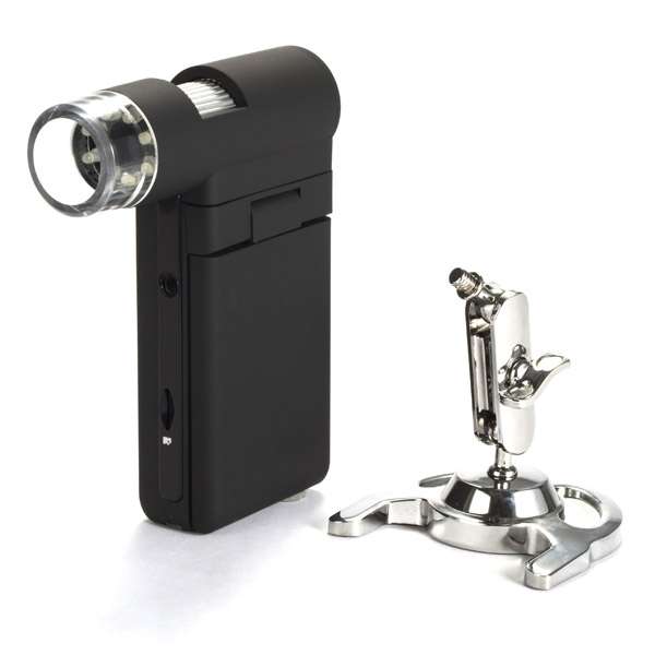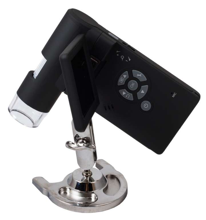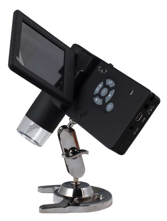 Портативный цифровой микроскоп с цветным ЖК-дисплеем (3") и 5-мегапиксельной камерой. Микроскоп дает увеличение 20x, 200x и 500x, увеличенное изображение выводится на экран. С помощью микроскопа можно делать фотографии и записывать видео, данные сохраняются на карту microSD. Подсветка с помощью 8 светодиодов регулируется по яркости. Для работы микроскопа используется встроенный литий-ионный аккумулятор (время работы – до 4 часов), питание может осуществляться от компьютера через USB-порт.Микроскоп Levenhuk DTX 500 Mobi – портативный цифровой микроскоп с цветным поворотным ЖК-дисплеем 3" и 5-мегапиксельной камерой. Микроскоп дает увеличение 20x, 200x и 500x, увеличенное изображение выводится на экран. С помощью микроскопа можно делать фотографии и записывать видео, данные сохраняются на карту microSD емкостью до 32 ГБ. Яркость светодиодной подсветки регулируется. Для работы микроскопа используется встроенный литий-ионный аккумулятор, рассчитанный на непрерывную работу до 4 часов. Питание микроскопа может осуществляться от компьютера через USB-порт. Микроскоп оснащен AV-выходом для подключения к телевизору или проектору. С помощью портативного цифрового микроскопа можно не только проводить визуальные исследования, но и измерять расстояния, площади, углы и радиусы наблюдаемых объектов. Прибор совместим с Windows и Mac.