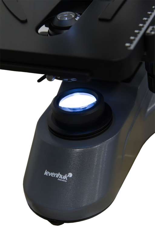 Освещение образцов происходит снизу, поэтому изучать можно только прозрачные препараты. Яркий светодиод направляет луч света через конденсор с ирисовой диафрагмой прямо на область исследований. Яркость подсветки и апертуру конденсора можно регулировать.