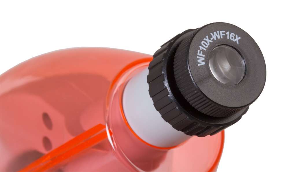 Микроскоп Levenhuk LabZZ M101 OrangeАпельсин способен впечатлить не только яркой расцветкой и необычным дизайном, но и оптикой высокого уровня. Револьверное устройство рассчитано на три объектива. Его можно вращать прямо во время наблюдений, чтобы быстро менять кратность микроскопа. Двухпозиционный окуляр – это два окуляра в одном. Одно положение окуляра дает 10-кратное увеличение, другое – 16-кратное. Общая кратность микроскопа находится в диапазоне от 40 до 640 крат.
