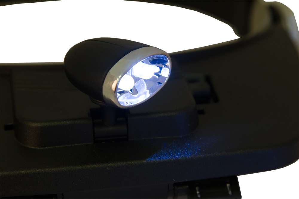 Лупа Levenhuk Zeno Vizor H3 фиксируется на голове при помощи специального гибкого обруча. Это помогает освободить руки для работы. Для освещения рабочей области используется светодиодная подсветка. Она работает от батареек, которые необходимо приобрести отдельно.