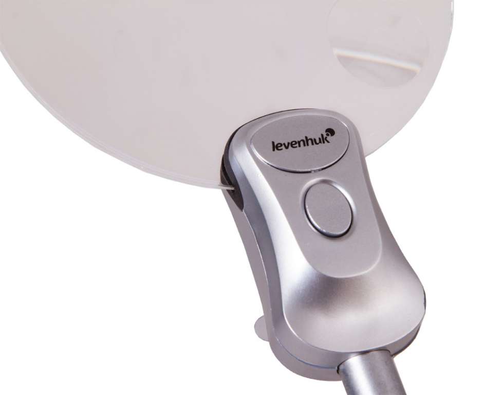 Levenhuk Zeno Desk D5 состоит из бифокальной линзы и гибкого металлического штатива. Покоится конструкция на устойчивом круглом основании. Две светодиодные лампочки ярко и равномерно освещают все пространство под линзой. Включить подсветку можно при помощи кнопки в верхней части корпуса.