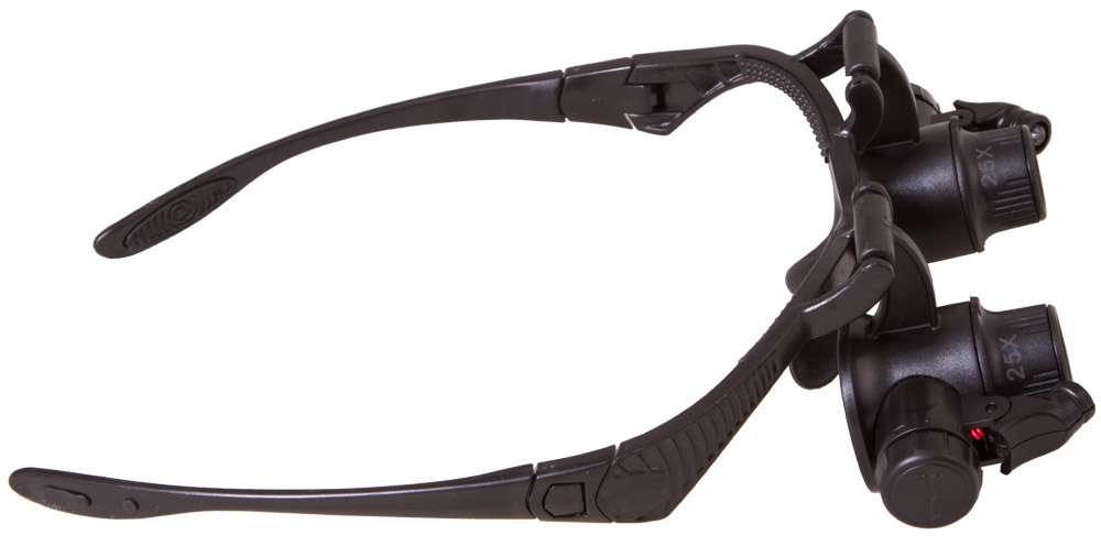 Лупа комплектуется сменными линзами для обоих глаз. Прямо «из коробки» вы получите диапазон увеличений от 10 до 25 крат. Встроенная подсветка пригодится для работы при скудном освещении. Яркие светодиоды расположены по бокам оправы и позволяют равномерно освещать рабочую область. Направление подсветки можно регулировать вручную. При необходимости во время работы любую из линз можно отвернуть наверх, чтобы посмотреть на рабочую область невооруженным глазом.
