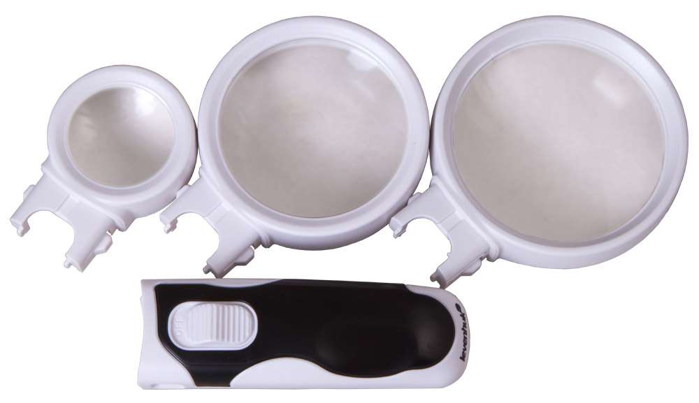 Levenhuk Zeno Multi ML11 заменит сразу три оптических инструмента. У нее три съемные линзы разного диаметра и кратности, они крепятся к удобной ручке. Простое надежное крепление позволяет менять линзы одним движением. В ручку встроена подсветка из двух ярких светодиодов. Кнопка включения тоже находится на ручке. Подсветка питается от 3 батареек типа ААА (в комплект не входят).