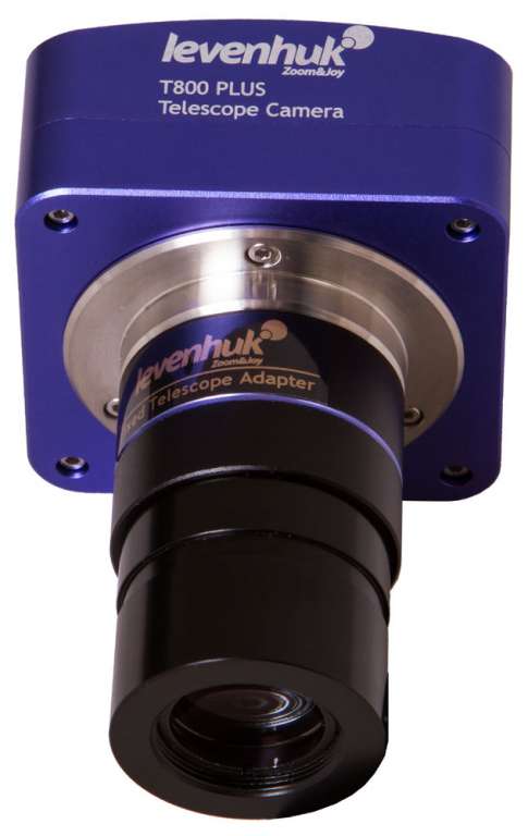 Цифровая камера Levenhuk T800 PLUS подойдет к телескопу любого бренда и системы. Она комплектуется адаптером для фокусера 1,25''. Камера подключается к компьютеру и питается через штатный USB-кабель.