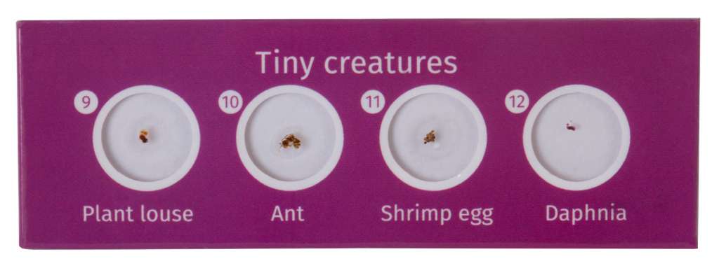 Образцы представлены в окошках круглой формы, подписаны и пронумерованы. Благодаря оклейке плотной разноцветной бумагой слайды отличаются надежностью и долговечностью. Образцы полностью готовы к использованию: ребенок сможет открыть коробку и сразу поместить понравившийся слайд на предметный столик микроскопа. Набор подходит для исследований в проходящем свете под окуляром любого биологического микроскопа с нижней подсветкой. Готовые слайды имеют выгодное преимущество перед препаратами, сделанными своими руками: образцы уже окрашены и зафиксированы, они не потускнеют со временем и будут видны максимально четко.