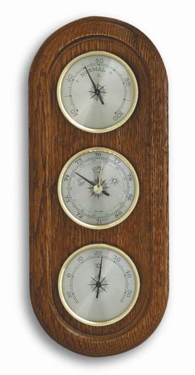 Механическая метеостанция изготовлена из натурального дерева дуба. В корпус погодной станции TFA 20100501B встроены термометр, гигрометр и барометр. Классическая погодная метеостанция – отличный деловой подарок, украшение кабинета или гостиной.