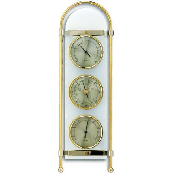 Погодная станция TFA203012 Frame solid brass показывает изменение атмосферного давления, температуру и влажность в помещении. Относительно не дорогая. Может стать хорошим подарком людям, которые реагируют на изменения атмосферного давления, рыбакам. Крепление на стене.