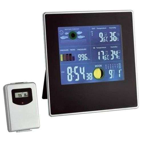 TFA Gallery – многофункциональная метеостанция в тонком черном корпусе и с цветным дисплеем. Метеостанция TFA Gallery имеет функции прогноза погоды на ближайшие 12-24 часа, индикация температуры и влажности воздуха внутри и снаружи помещения, индикация атмосферного давления за последние 12 часов, индикация текущей фазы Луны, электронные часы, будильник, календарь. Характеристики: Цветной дисплей Подсветка: постоянная подсветка дисплея будет только в случае работы с блоком питания. Прогноз погоды на ближайши