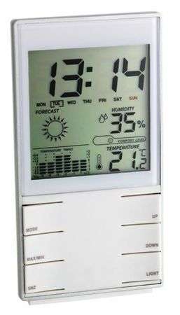 Погодная станция TFA 35110202Комнатная температура (0°C - +50°C) Гигрометр 20% - 99%Уровень комфортаГрафик изменения температуры за прошедшие 12 часовСимвольный прогноз погодыЧасы с календарёмБудильник с функцией короткого снаПитание 2 x 1,5 V AAAРазмер: 75 x 20 x 140 ммВес: 132 гргарантия 1 год