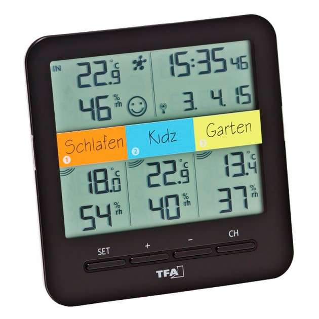 • Устройство идеально подходит для мониторинга комнатного климата в различных помещениях. • Простой просмотр измеренных величин с помощью индивидуального нанесения обозначений месторасположений. • В комплект входит 3 беспроводных передатчика для измерения температуры и влажности.