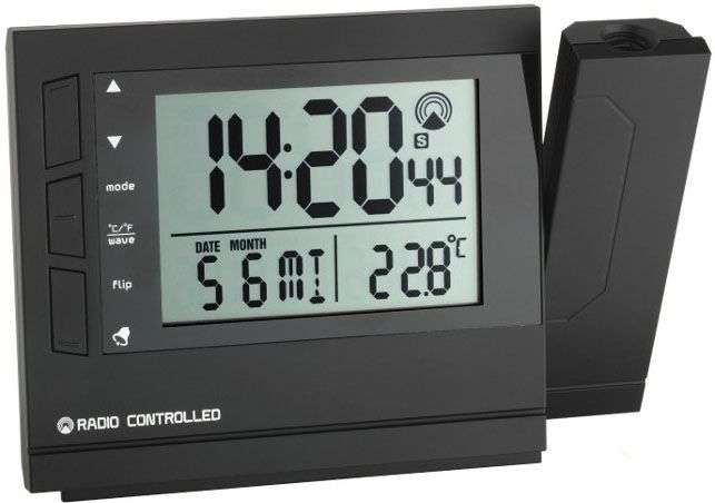 проекционные часыфункция радиоконтроля сигнала точного времени по сигналу DCF-77ручная установка времениЖК-экранцвет подсветки экрана - белый12/24 часовой формат временипроекция времени на стену или потолокцвет проекции - красный2 независимых будильникафункция повторного срабатывания сигнала "Snooze"календарьвыбор языка отображения дня недели (французский, английский, немецкий, итальянский, испанский, датский, голландский)термометр в °С и °Fдиапазон измерения температуры -9.9 °C...+59.9°С/+14.1°F...+139.8°F