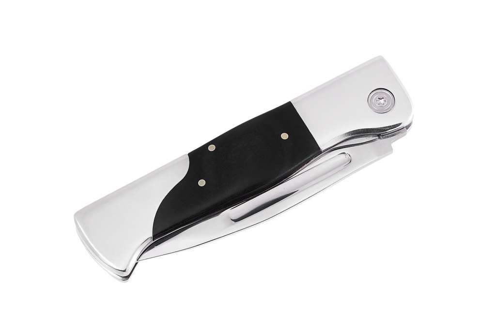 Рукоять ножа образована стальными лайнерами и снабжена красивыми накладками из натурального дерева. Темное натуральное дерево отлично гармонирует с зеркальной полировкой клинка.