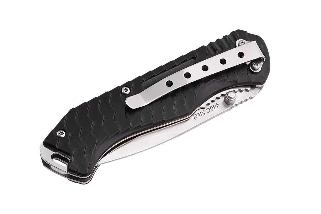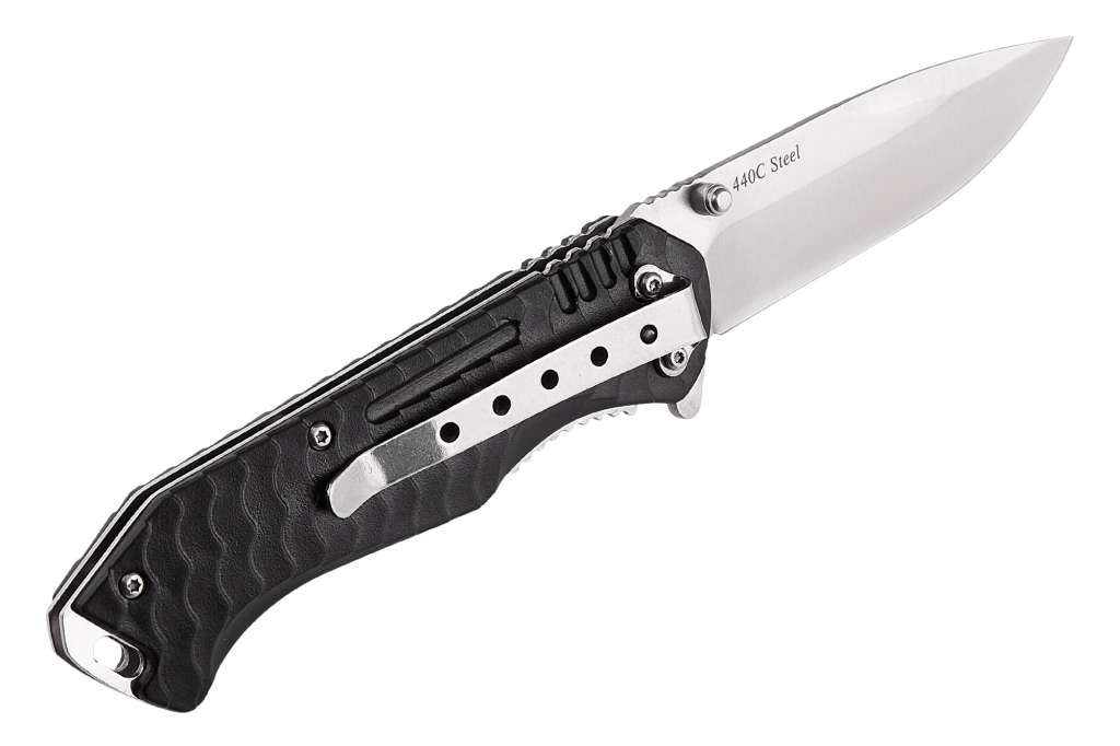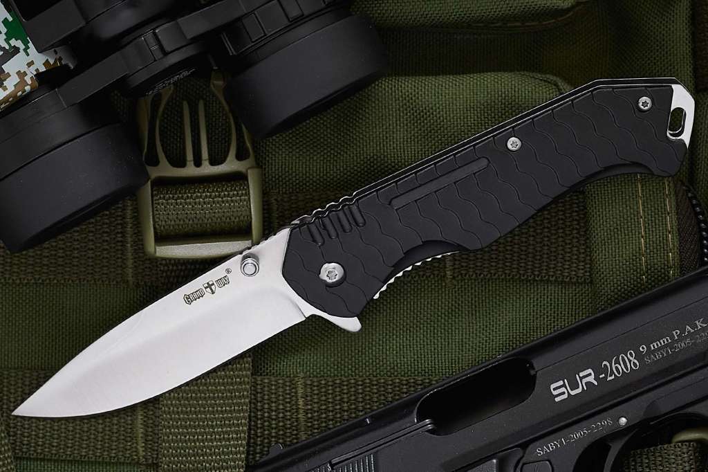 При этом, способов раскладывания у него как минимум два – обычный, при помощи шпеньков, и гораздо более быстрый, при помощи выступа-плавника на клинке. Чтобы разложить клинок, нужно нажать на плавник пальцем. После этого он еще и служит в качестве упора-ограничителя для пальцев.