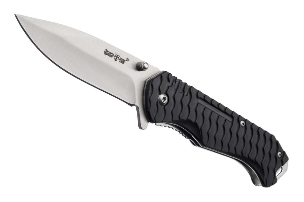 Рукоятка складного ножа 6788 PC Grand Way снабжена пластиковыми накладками с волнистым узором, обеспечивающим ее ребристой насечкой, а также декоративно-функциональными выемками, которые украшают его и повышают удобность использования. Металл рукояти немного выступает за пластик накладок и в этом выступе сделаны отверстия для темляка.