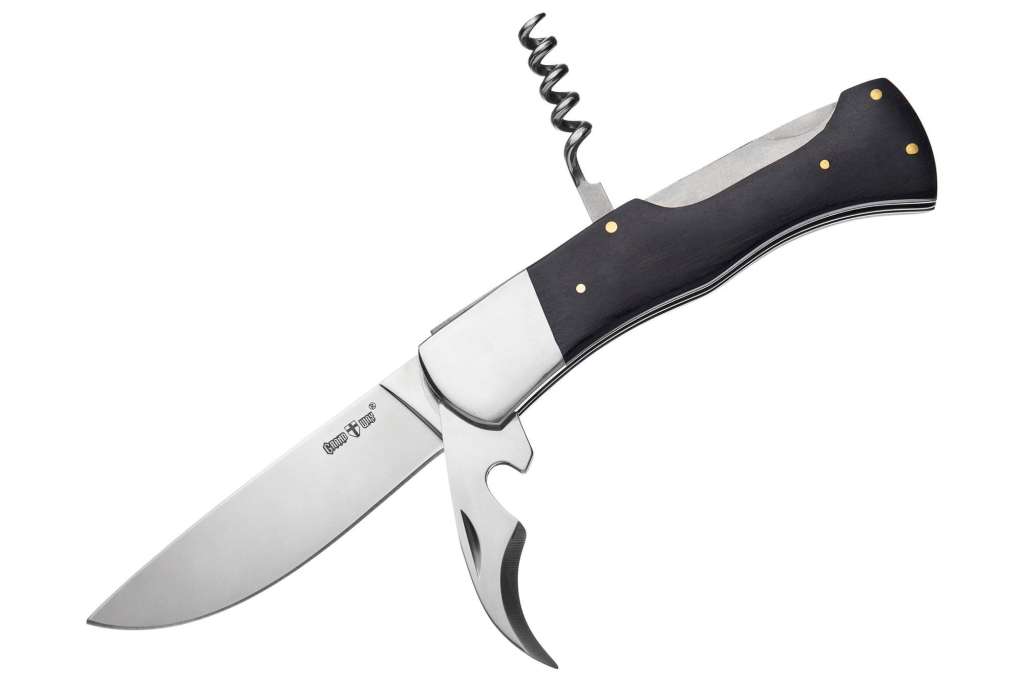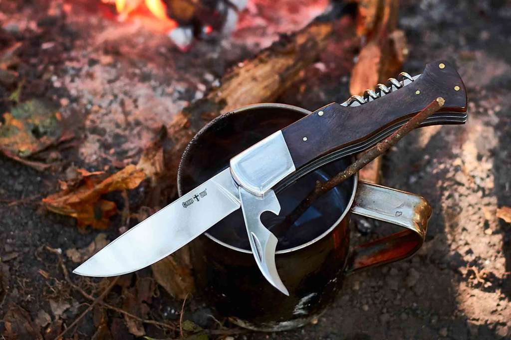 Помимо своей основной функции, нож может выполнять функции консервного ножа и штопора. Рукоять ножа выполнена с применением деревянных и стальных накладок. Древесина прошла специальную обработку, устойчива к влаге, гниению и вредителям. Темный палисандр великолепно сочетается с холодным блеском полированного клинка. Помимо этого, красивая деревянная рукоять несет и чисто функциональную нагрузку - зимой такая рукоять не холодит руки.