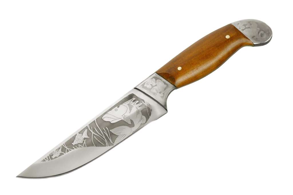 На боковые поверхности клинка нанесены изображения рыб и другие рисунки на рыбацко-охотничью тематику.