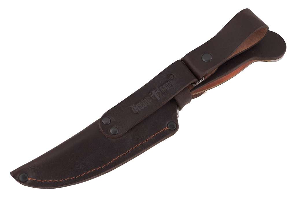 Рыбацкий-2 укомплектован ножнами-чехлом из кожи, с которыми его удобно носить на ремне или хранить в рюкзаке.