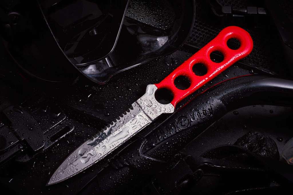 Нож исключительно надежен, ведь клинок и рукоять выполнены из одного куска высококачественной стали марки 440С. Эта, отработанная в производстве сталь, уже давно стала стандартом для изготовления качественных ножей. Высокое содержание углерода обеспечивает качественный длительный рез, а дополнительные добавки молибдена и ванадия делают эту сталь износостойкой, прочной и стойкой к ржавчине. Некоторая сложность в заточке компенсируется продолжительной работой лезвия без дополнительной правки. Для работы с волокнистыми материалами под водой клинок ножа оснащается дополнительной волнистой заточкой на обухе. Рукоять ножа покрыта ярким полимерным составом для удобства удержания и лучшей видимости. Ряд крупных отверстий в рукояти облегчает конструкцию ножа, делает более удобной в работе и позволяет крепить нож на страховочный шнур или темляк. Жесткие пластмассовые ножны могут свободно размещаться как на теле пловца так и на снаряжении и оснащены очень прочной и надежной защелкой исключающую потерю ножа.
