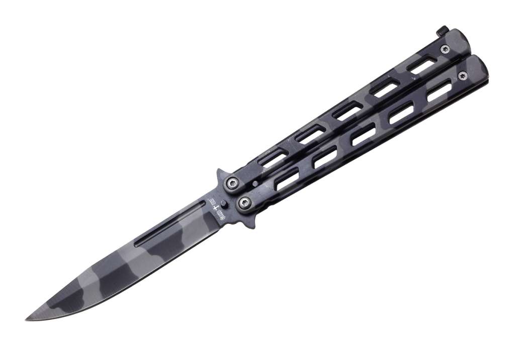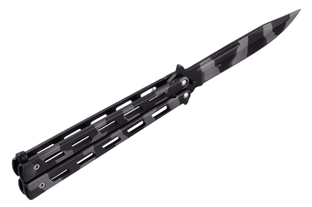 Балисонг 1024 B – хороший вариант для уже увлекающихся флиппингом или для только недавно решивших заняться изучением приемов обращения с ножом-бабочкой. В целом, 1024 B – интересная по дизайну и запоминающаяся внешне модель: клинок и рукоять в камуфляжных цветах и современная скелетная конструкция. Клинок оснащен декоративно-функциональным скосом обуха долом.