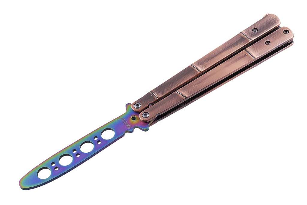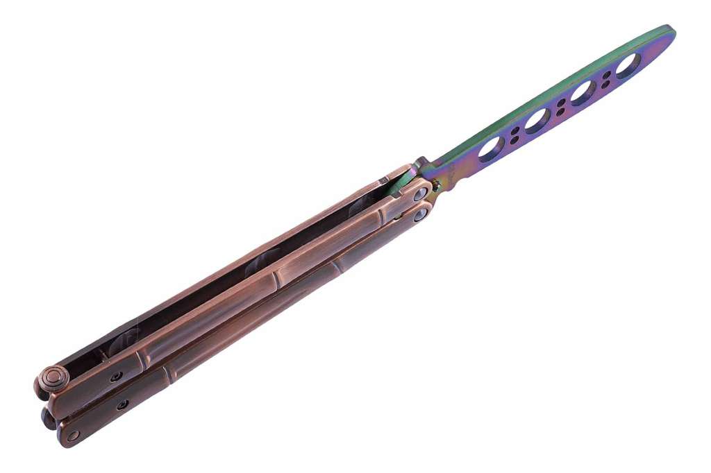 Тренировочный нож-балисонг – это качественное приспособление, позволяющее тренироваться в флиппинге и отрабатывать множество других приемов обращения с таким типом ножей. Как такового клинка у него нет – его роль играет пластина, отверстиями, которые несут как декоративную, так и практическую функцию: облегчать вес.