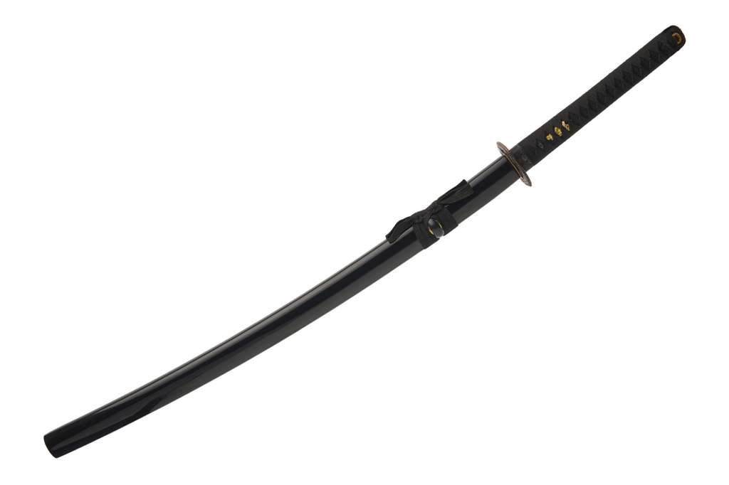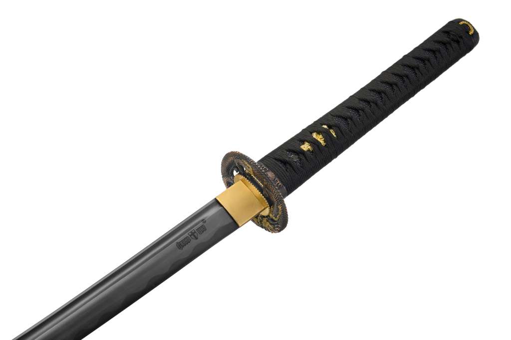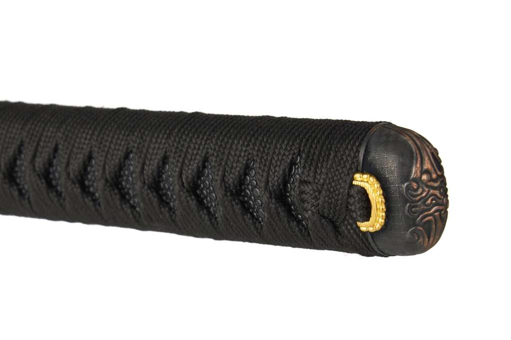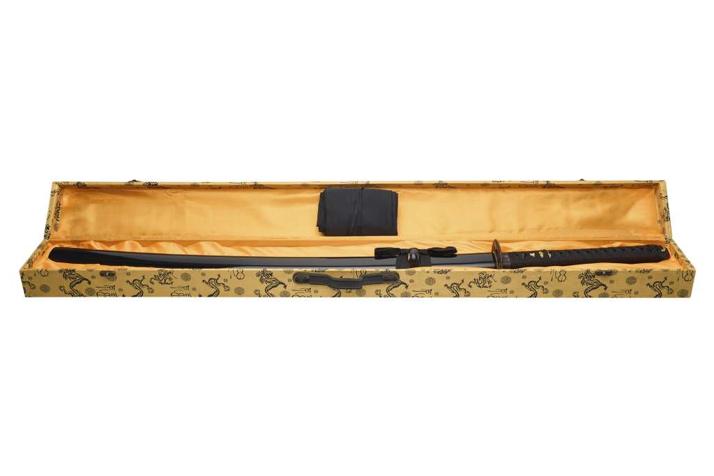 Поверхность клинка стильно анодирована в чёрное антибликовое покрытие. Фурнитура выполнена качественно, с тщательным соблюдением восточного стиля. Меч комплектуется традиционного вида ножнами и красивой подарочной коробкой.