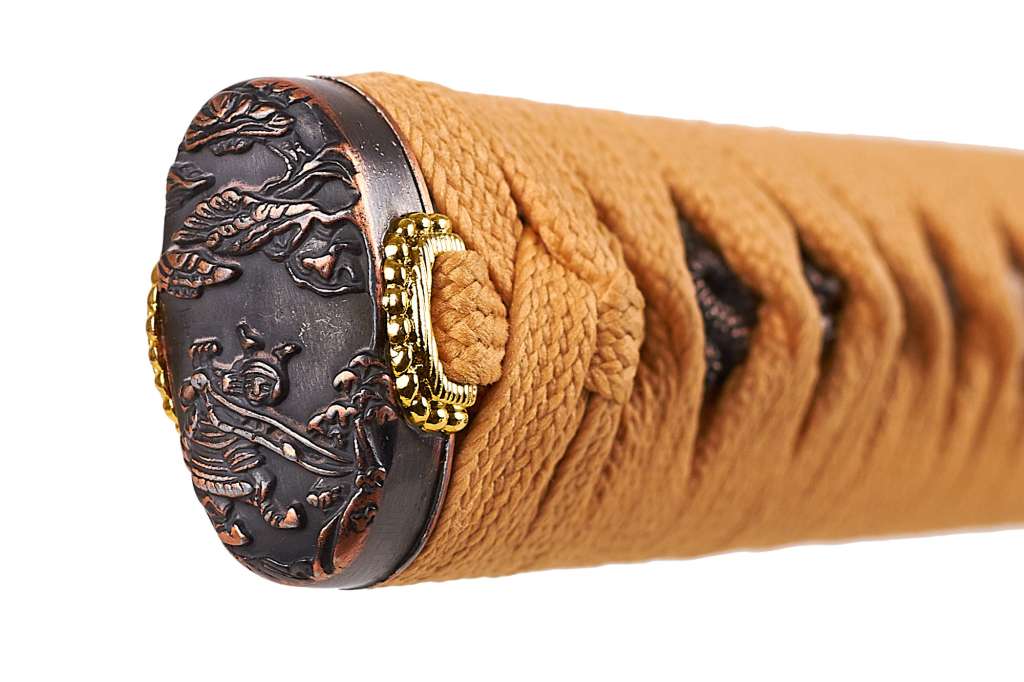 Реплика выполнена с достаточно высоким вниманием изготовителя к качеству и деталям. Оранжевая оплётка рукояти (цука-ито) прекрасно сочетается с белой самэ (обтяжкой рукояти). Имеется даже традиционное украшение под оплёткой – менуке. Литое навершие рукояти (касира) украшено изображением самурая вооружённого луком, выполненным в традиционной манере. Клинок имеет чёрное анодированное покрытие.