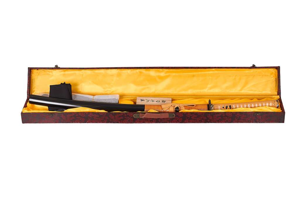В комплект также входят: подарочная деревянная коробка, обтянутая шёлком, подставка, тканевой чехол, набор по уходу за катаной.